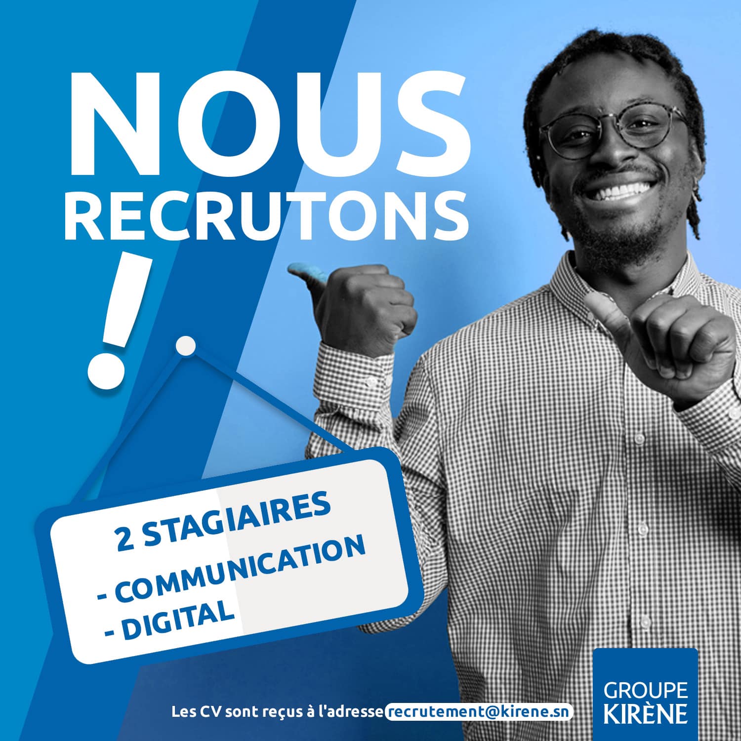 Le groupe recherche actuellement deux stagiaires en communication et digital. Pour postuler, il suffit d’envoyer votre candidature à l’adresse mail: recrutement@kirene.sn
