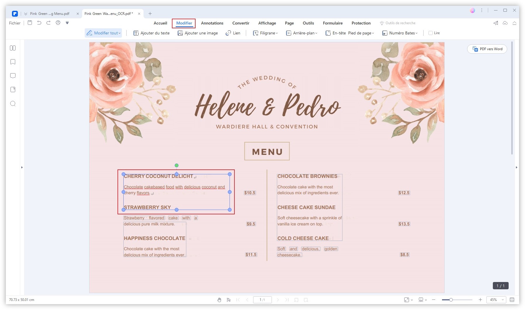 Si vous souhaitez apporter des modifications à un document PDF existant ou à un formulaire, c’est très facile grâce aux menus Modifier et Formulaire. Voici quelques exemples de modifications que vous pouvez apporter à votre document.