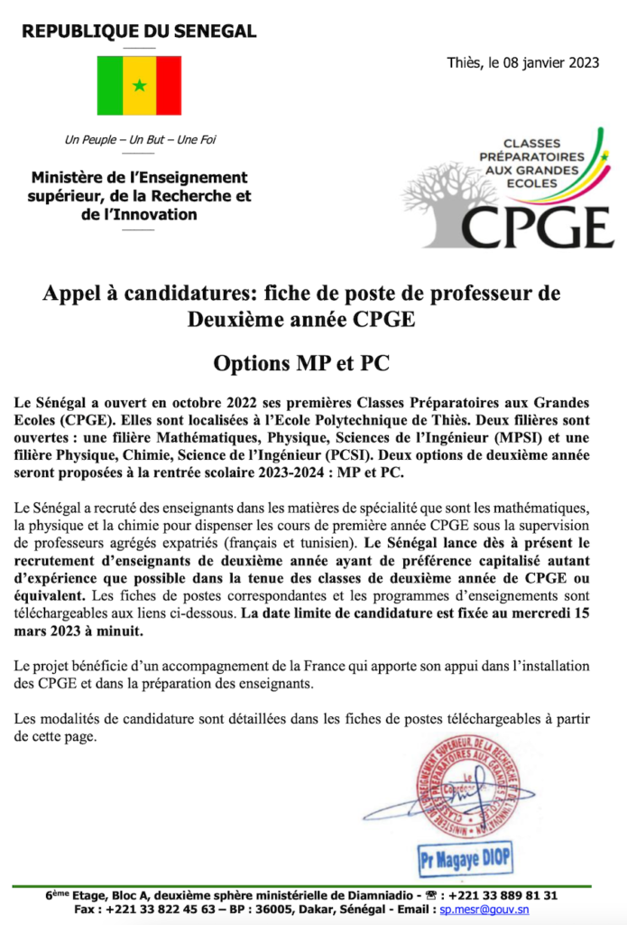 Appel à candidatures: fiche de poste de professeur de Deuxième année CPGE Options MP et PC