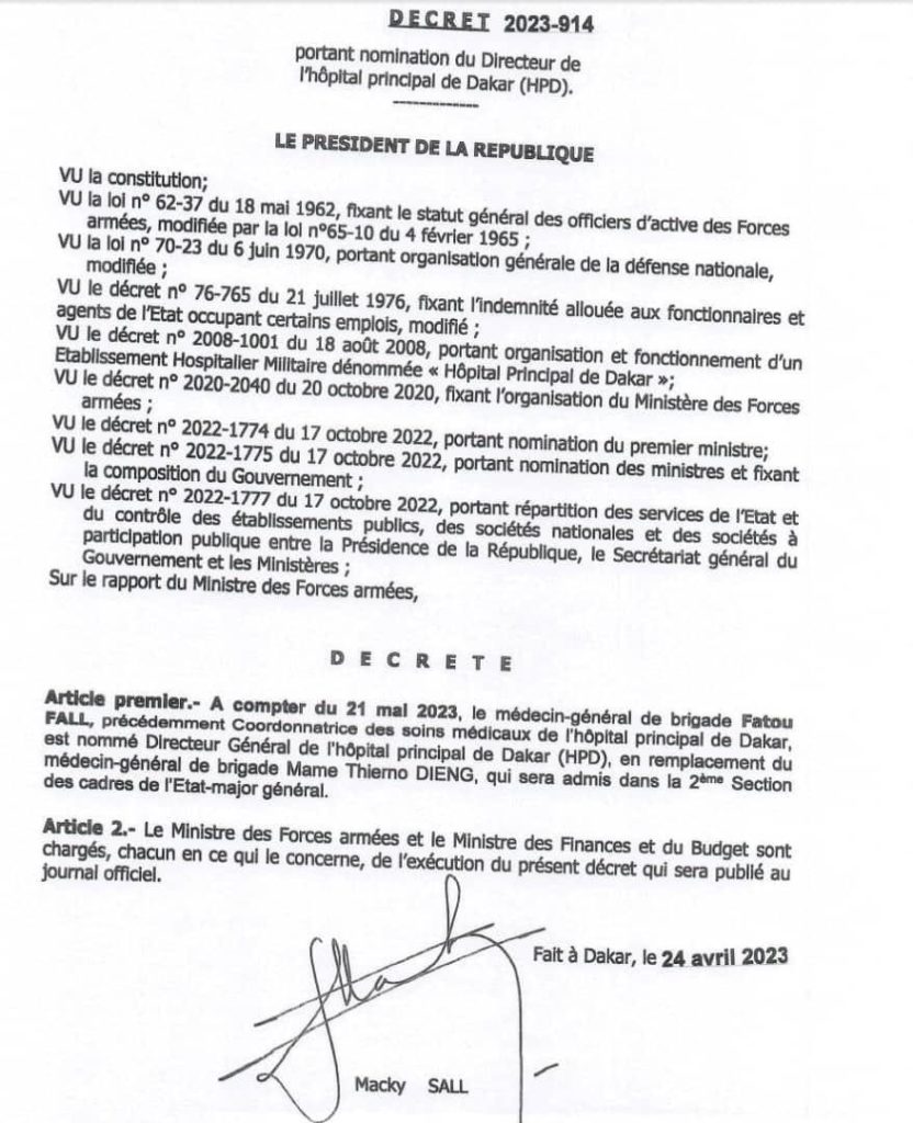 Conformément à ses prérogatives découlant de la constitution à son article 45, « Le chef de l’état a nommé au grade de médecin général le médecin-colonel, Fatou Fall’’, a fait part Me Sidiki Kaba, ministre des forces armées, à l’occasion de la cérémonie d’installation du chef d’état major général des armées, Mbaye Cissé, ce mardi 25 avril 2023, au quartier Dial Diop.