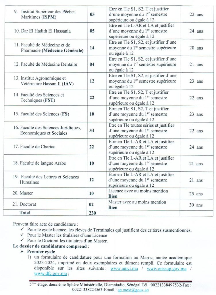 Le Ministère de l’Enseignement supérieur, de la Recherche et de l’Innovation annonce que le Gouvernement du Royaume du Maroc, par l’entremise de l’Agence Marocaine de la Coopération internationale (AMCI), a mis à la disposition du Gouvernement du Sénégal deux centre trente (230) bourses d’études, au titre de l’année académique 2023/2024.
