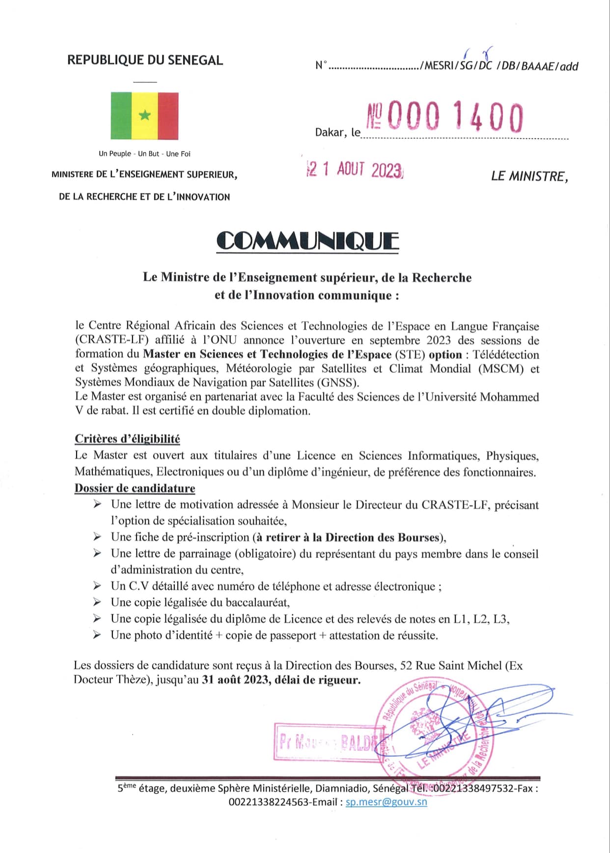 Le Centre Régional Africain des Sciences et Technologies de l’Espace en Langue Française (CRASTE-LF), affilié à l’ONU, lance la candidature aux sessions de formation pose-graduée, Master en Sciences et Technologies de l’Espace (STE), années 2023 – 2025.