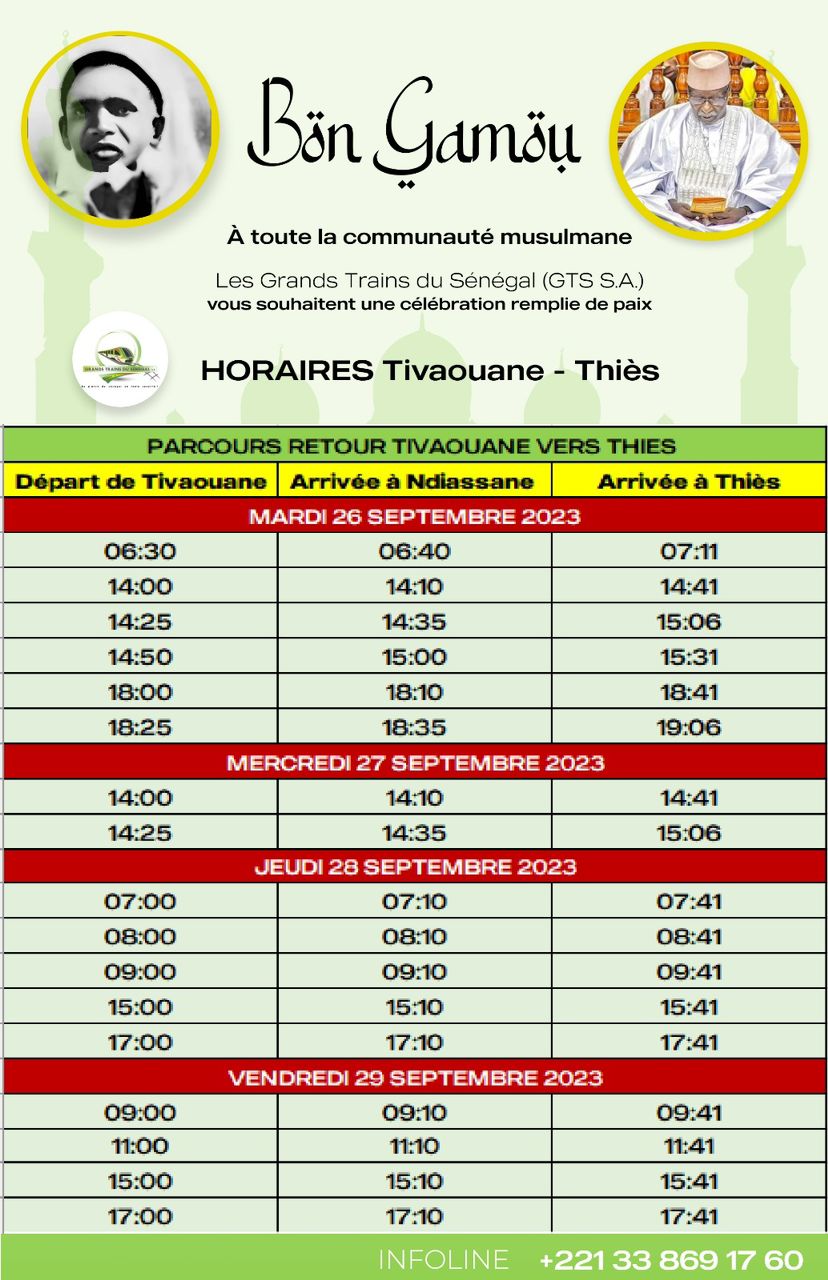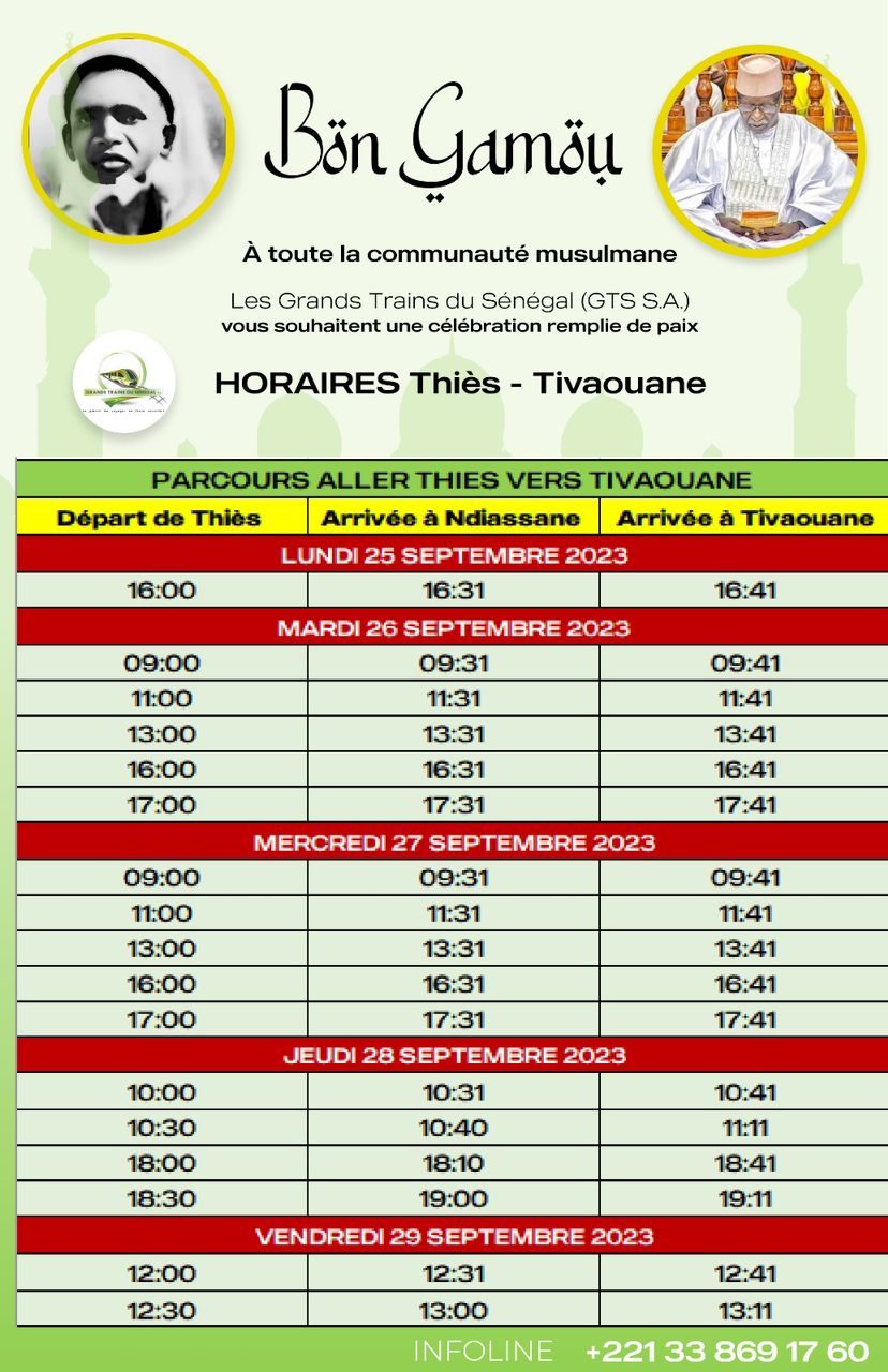 Selon le Directeur Général de GTS SA : » 34 navettes sont programmées pour le grand Gamou entre Thiès et Tivaouane, avec une escale commerciale à Ndiassane.»