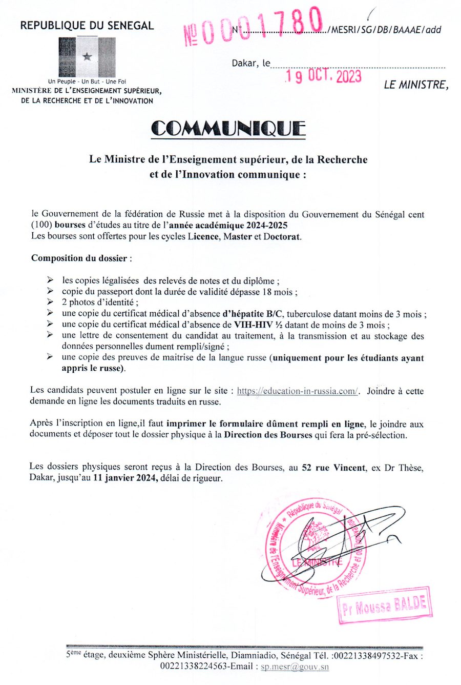 Le gouvernement de la Fédération de Russie met à la disposition du gouvernement du Sénégal 100 bourses d’études au titre de l’année académiques 2024- 2025. Ces bourses sont offertes pour les cycles Licence, Master et Doctorat.