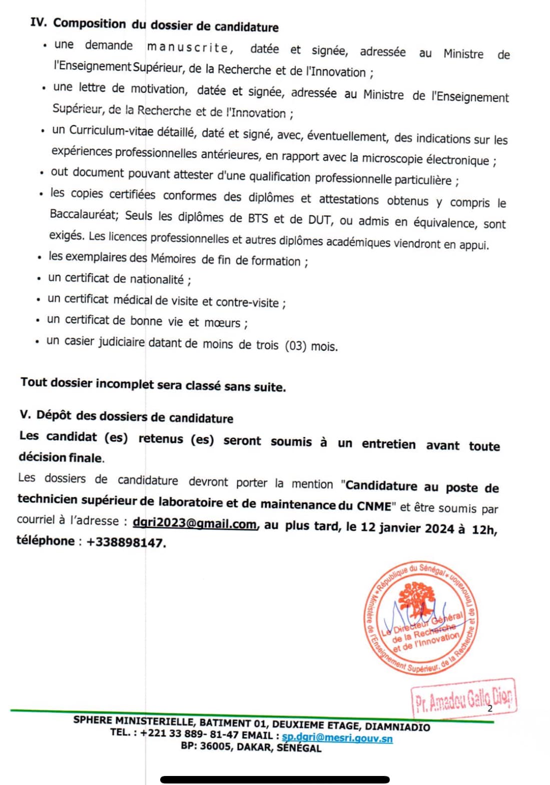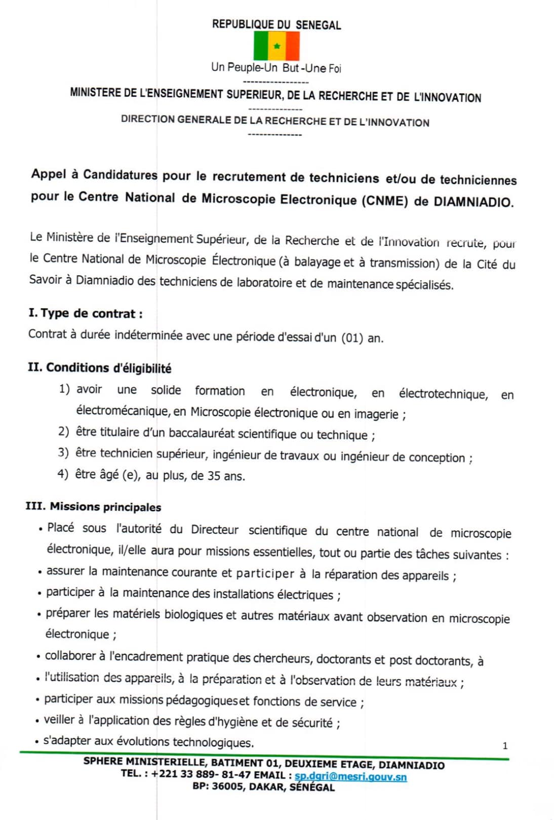 Le Ministère de l’Enseignement supérieur, de la Recherche et de l’Innovation recrute, pour le Centre national de Microscopie électronique de la Cité du Savoir de Diamniadio des techniciens de laboratoire et de maintenance spécialisés.