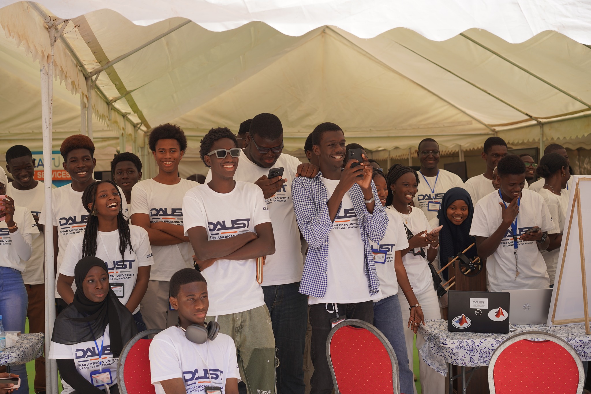 À quelques mètres du grand Hôtel les Baobabs de Somone, une ruelle mène à un terrain de basket transformé pour l’occasion en espace d’exposition. Là, on se sentirait presque aux États-Unis, tant l’anglais y est couramment parlé par les étudiants. Le bruit des machines en test dans certains stands se mêle aux conversations animées entre les porteurs de projets et les visiteurs. Dès l’entrée, le ton était donné : des groupes d’étudiants s’affairaient autour de leurs stands, apportant les touches finales à leurs inventions qui pourraient bien façonner les contours de demain.