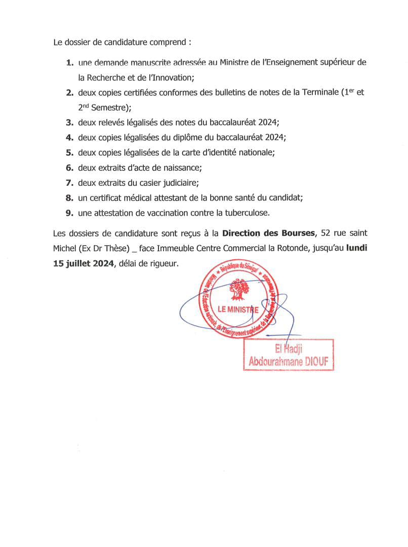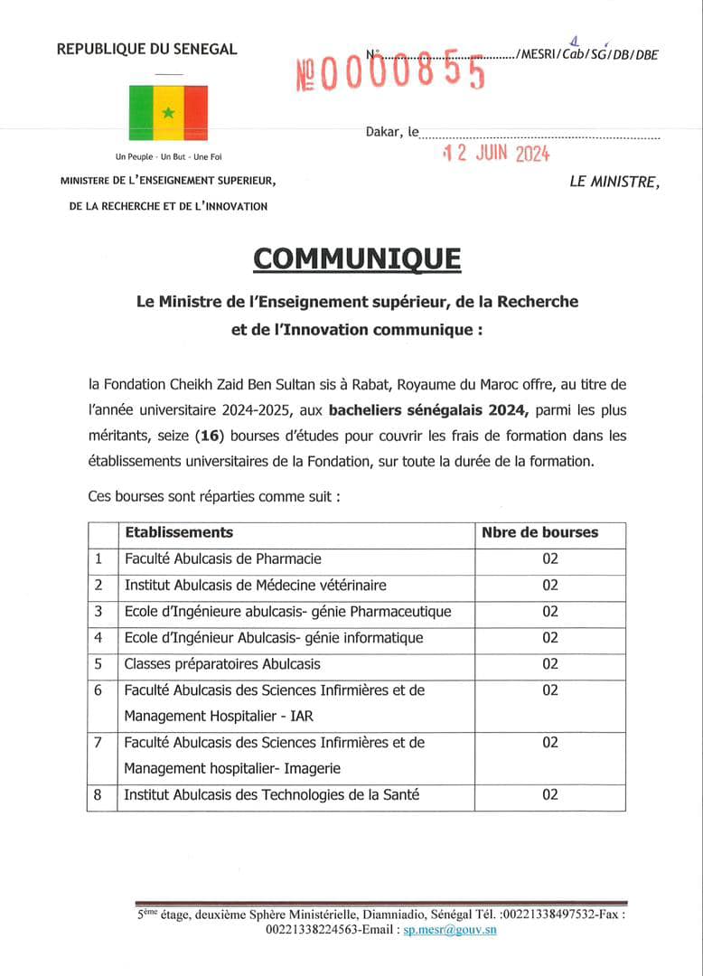 La Fondation Cheikh Zaid Ben Sultan sis à Rabat, Royaume du Maroc offre, au titre de l’année universitaire 2024-2025, aux bacheliers sénégalais 2024, parmi les plus méritants, seize (16) bourses d’études pour couvrir les frais de formation dans les établissements universitaires de la Fondation, sur toute la durée de la formation.
