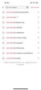 Faisons l’exemple en tapant sur la barre de recherche Tiktok et la barre de recherche Google pour faire des recherches neutres sur la requête “ AZIZ DABALA “.