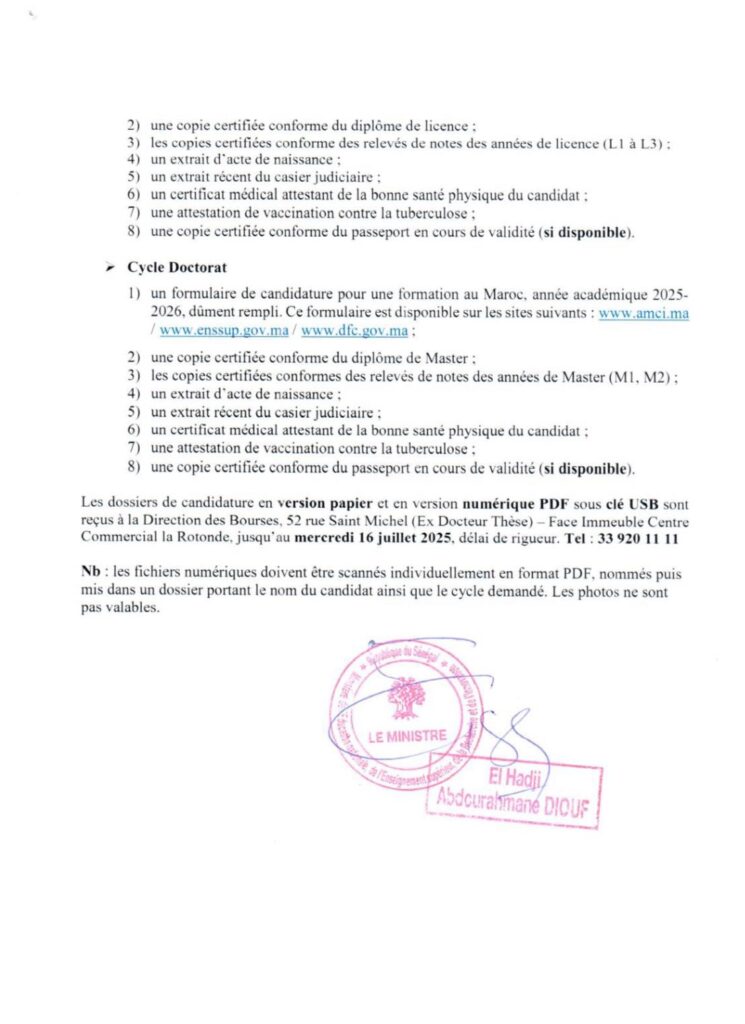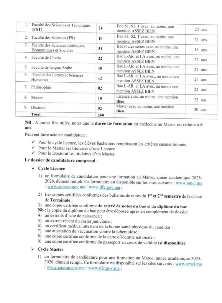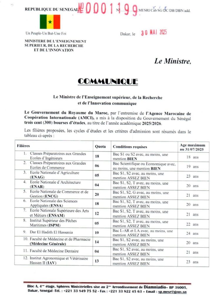 Le ministère de l’Enseignement supérieur, de la Recherche et de l’Innovation annonce que le Gouvernement du Royaume du Maroc, par l’intermédiaire de l’Agence Marocaine de Coopération Internationale (AMCI), a mis à la disposition du Sénégal trois cents (300) bourses d’études pour l’année académique 2025/2026. Les filières proposées, les cycles d’études et les critères d’admission sont détaillés dans le tableau ci-après.