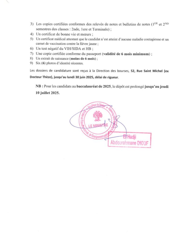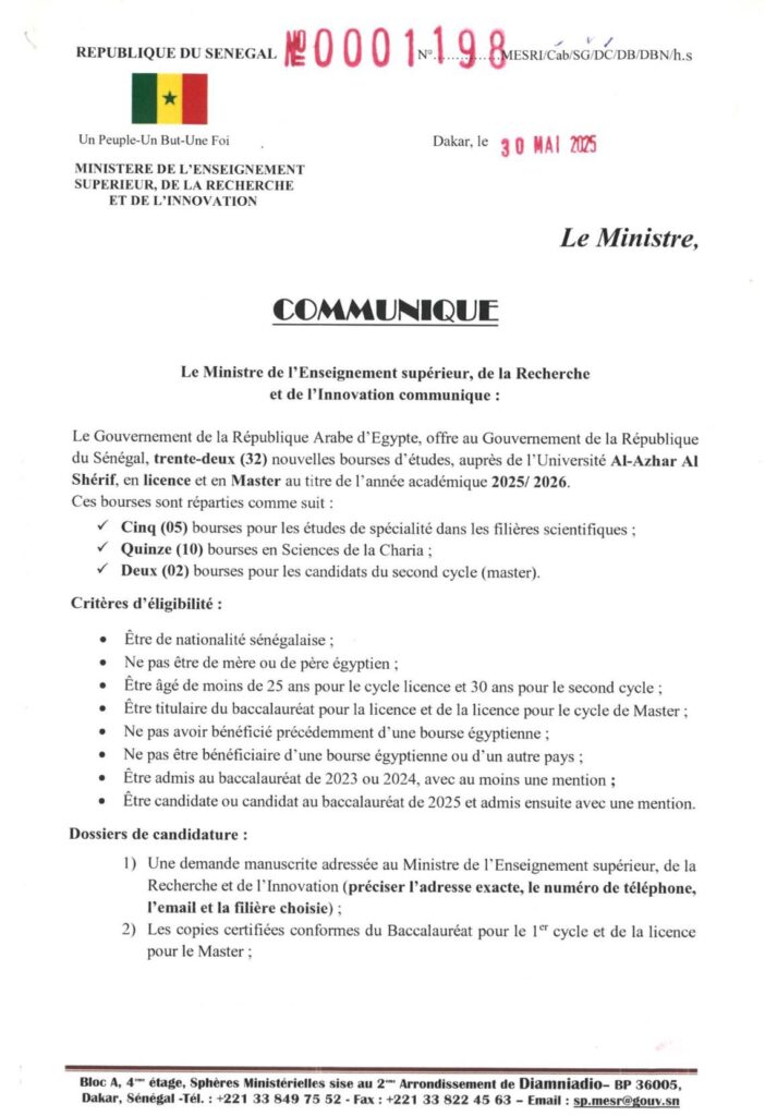 Le ministère de l’Enseignement supérieur, de la Recherche et de l’Innovation annonce que le Gouvernement de la République Arabe d’Égypte offre au Sénégal trente-deux (32) nouvelles bourses d’études pour les niveaux Licence et Master, auprès de l’Université Al-Azhar Al Shérif, au titre de l’année académique 2025/2026.