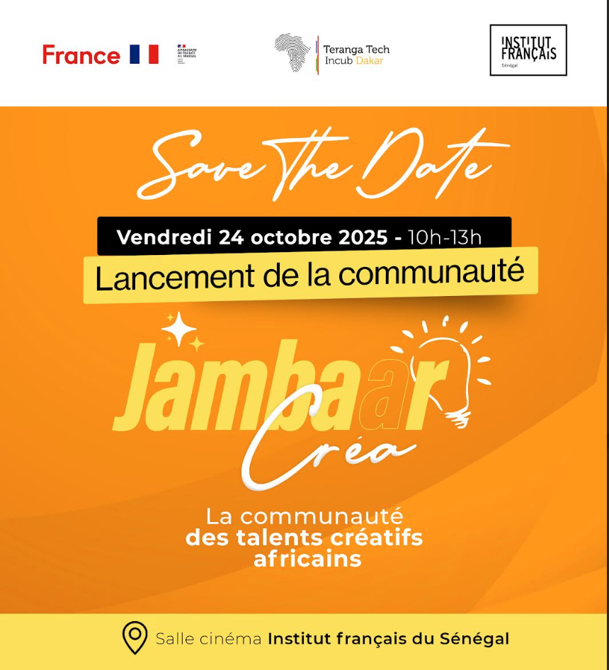 Dakar, le 16 octobre 2025– Teranga Tech Incub, l’incubateur de l’Ambassade de France au Sénégal, annonce le lancement officiel de Jàmbaar Créa, une nouvelle communauté dédiée à l’accélération et à la professionnalisation des talents issus des Industries Culturelles et Créatives (ICC) au Sénégal. Le lancement se tiendra le vendredi 24 octobre à 10h à l’Institut français de Dakar.