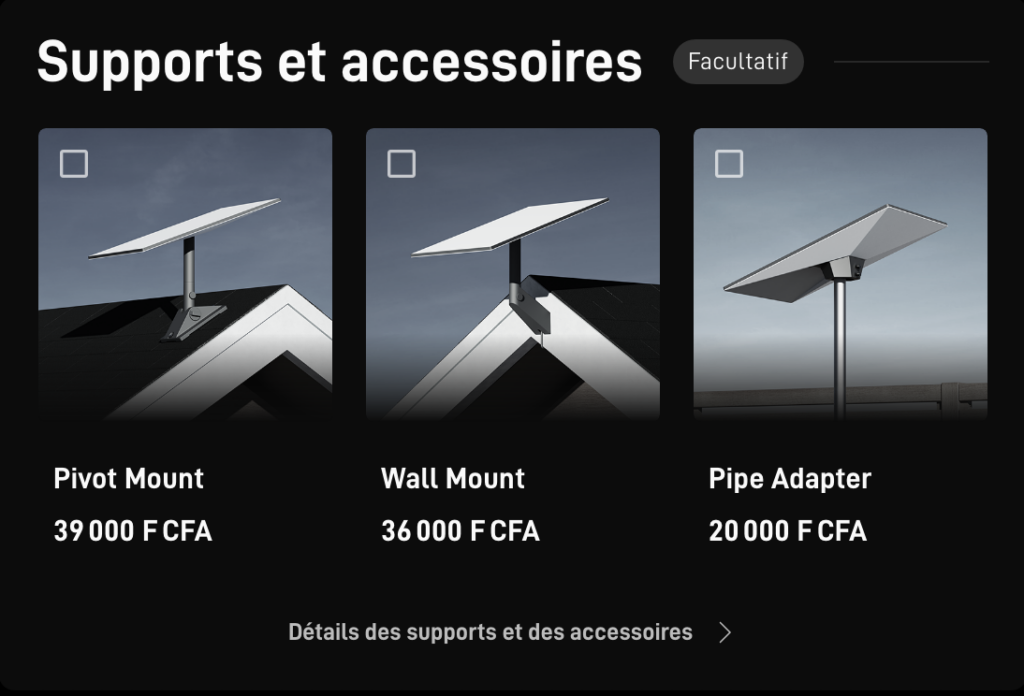 Le kit matériel Starlink comprend l’antenne parabolique, le routeur Wi-Fi, et les câbles nécessaires. Le coût de ce kit est fixé à XOF 160,000 . Ce coût est une dépense unique qui vous permet de bénéficier de l’internet par satellite.