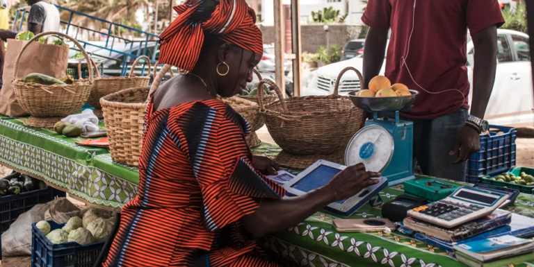 Une femme sur un marché de Dakar traite une commande de légumes à l’aide de sa tablette Weebi. © Vincent Tremeau / La Banque mondiale